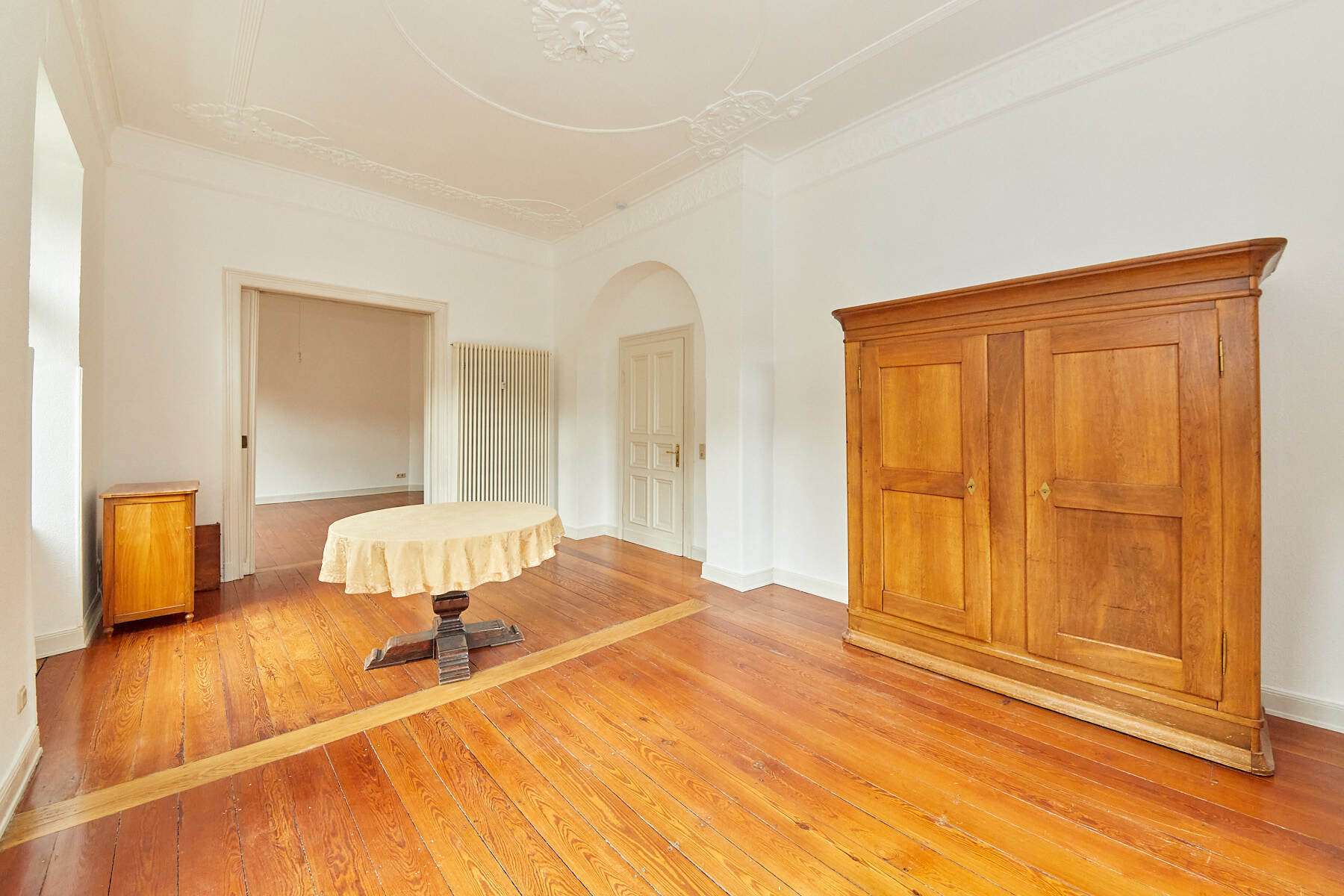 In der Wohnung sind viele historische Details zu bewundern. Holzdielen, Ornamentfliesen, feinster Deckenstuck und Kassettentüren schaffen ein wunderbares Ambiente.